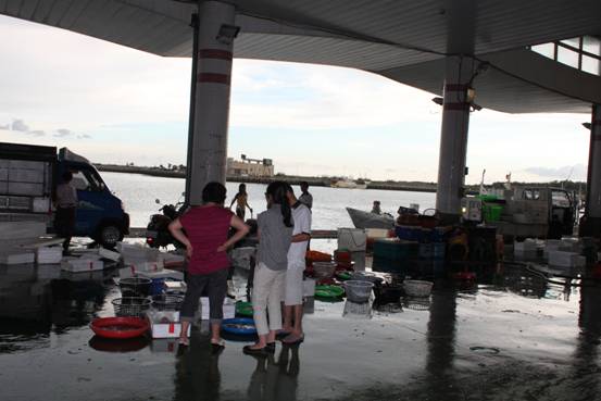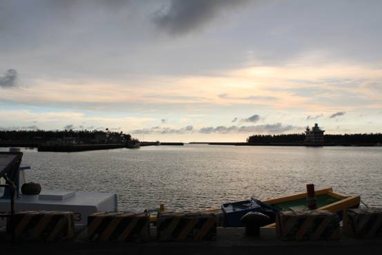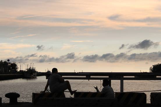 到時已經接近黃昏,漁港的黃昏下兩個漁夫正在討論魚貨。